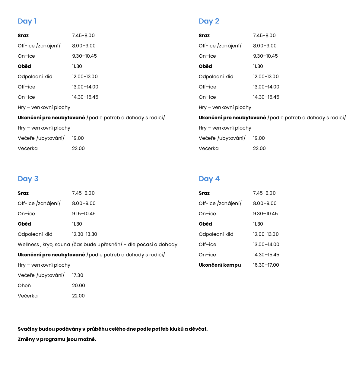Stejně jako v předchozích ročnících se budeme zaměřovat na rozvoj hokejových dovedností v herním prostředím, na jejich přenášení přímo do hry. Na součinnosti a to nejen na ledě, ale během celého kempu.
